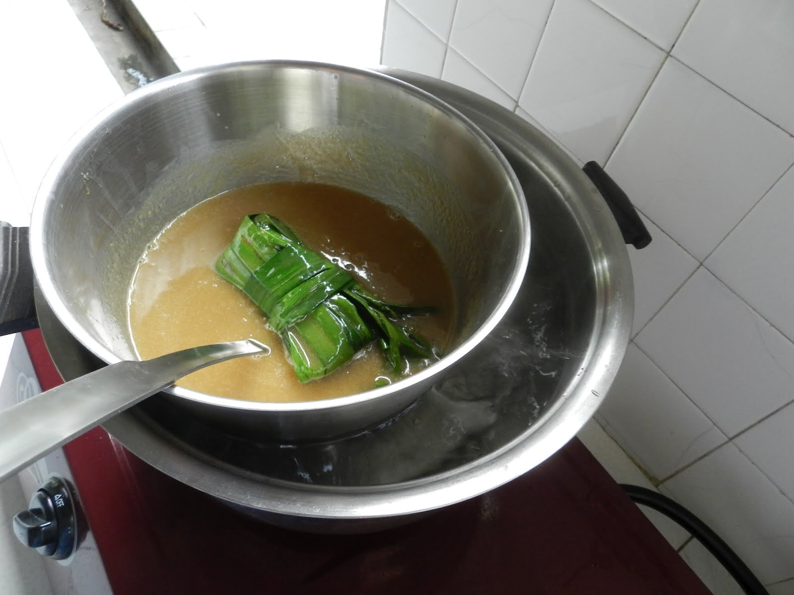3 Get ready another larger pot with boiling water. Put the aluminium pot fill with coconut egg mixture into the larger pot with boiling water ( double boil way) and stir . Keep stirring continuously until the mixture becomes thick ( it took me about 50 -60 minutes).
